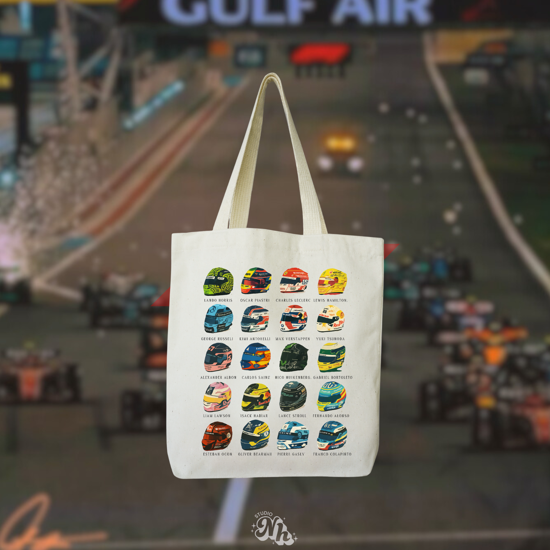♡ 1 Totebag beige con todos los cascos del 2025